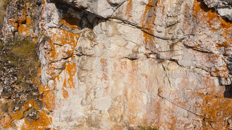 Бажуково, Россия. Скала Писаника. Наскальные рисунки сделаны более 3000 лет назад. Падение. Река Серга. Оленьи ручьи - природный парк в лесистой местности, Aerial View