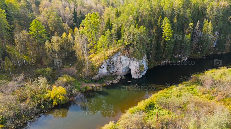 Бажуково, Россия. Каменная дыра или пьяный конь. Осенний пейзаж. Река Серга. Оленьи ручьи. Природный парк в лесистой местности, известной богатой флорой, вид с воздуха