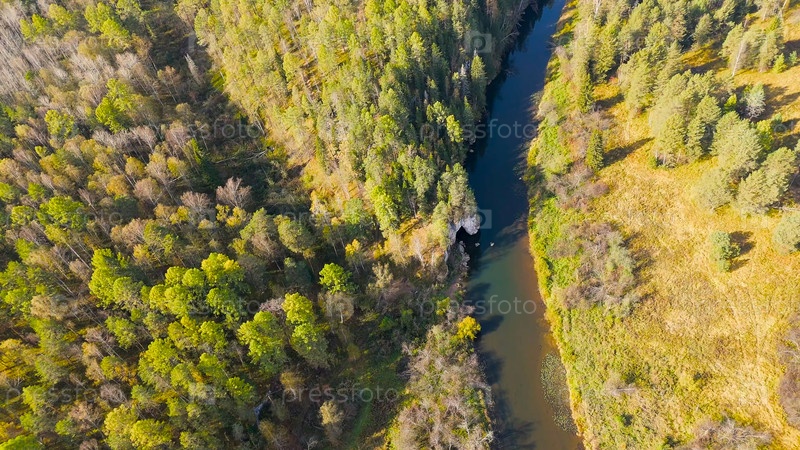 Бажуково, Россия. Каменная дыра или пьяный конь. Осенний пейзаж. Река Серга. Оленьи ручьи. Природный парк в лесистой местности, известной богатой флорой, вид с воздуха