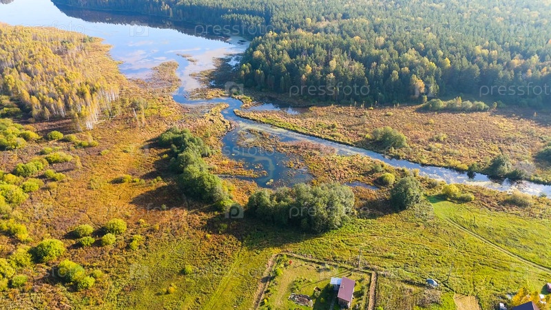 Екатеринбург, Россия. болотистые реки и пруд. Наклонитесь вверх и летите вперед, взгляд с воздуха