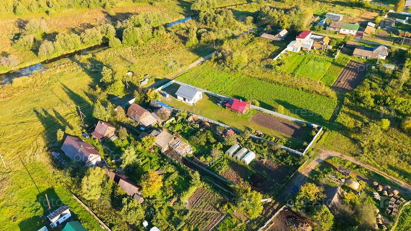 Екатеринбург, Россия. болотистая река и хвойный лес вдоль берегов и дома на окраине деревни. вечернее время, ранняя осень, взгляд с воздуха