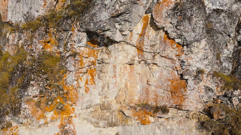 Бажуково, Россия. Скала Писаника. Наскальные рисунки сделаны более 3000 лет назад. Падение. Река Серга. Оленьи ручьи - природный парк в лесистой местности, Aerial View