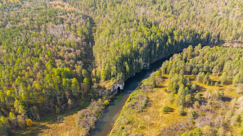 Бажуково, Россия. Каменная дыра или пьяный конь. Осенний пейзаж. Река Серга. Оленьи ручьи. Природный парк в лесистой местности, известной богатой флорой, вид с воздуха