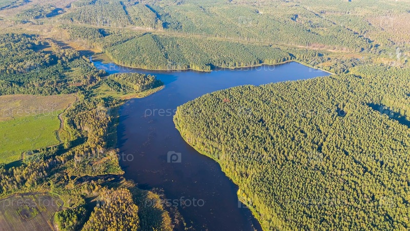 Екатеринбург, Россия. болотистое озеро, река и хвойный лес вдоль берегов. Вечернее время, ранняя осень, Aerial View
