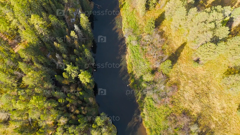 Бажуково, Россия. Осенний ландшафт. Река Серга. Оленьи ручьи. Природный парк в лесистой местности, известной богатой флорой, вид с воздуха