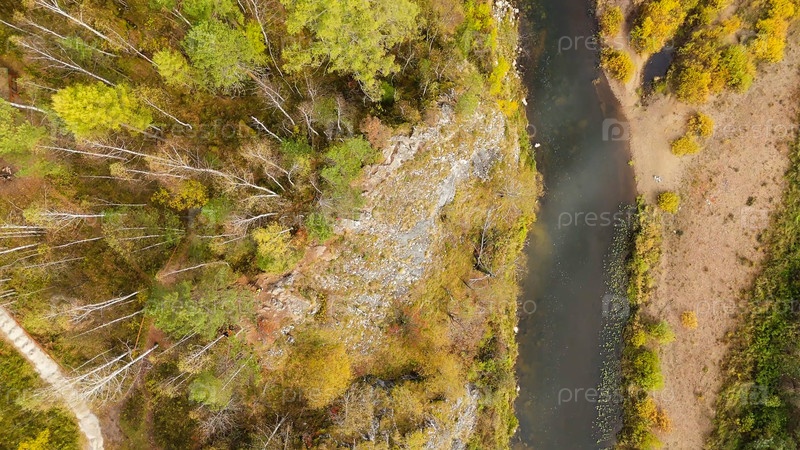 Бажуково, Россия. Светлая скала. Осенний пейзаж. Река Серга. Рейндерные ручьи - природный парк в лесистой местности, известный своей богатой флорой, вид с воздуха