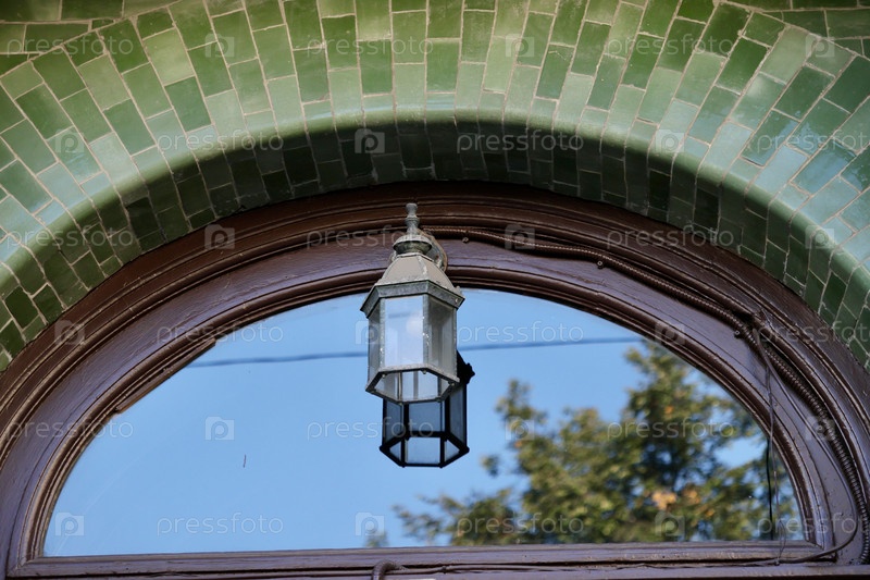 Зеленый уличный фонарь на фоне полукруглого окна