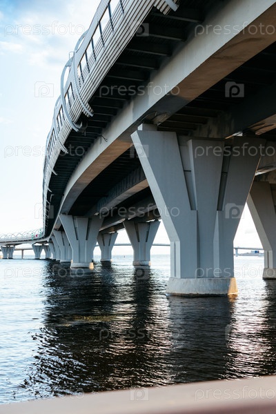 Вид с нижней части арки подвесной дороги, моста над водой, скоростной трассы против неба