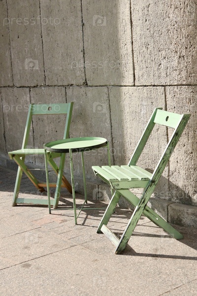 Кафе на открытом воздухе, зеленый стол и стул на фоне каменной стены. туристическое место для завтрака, обеда