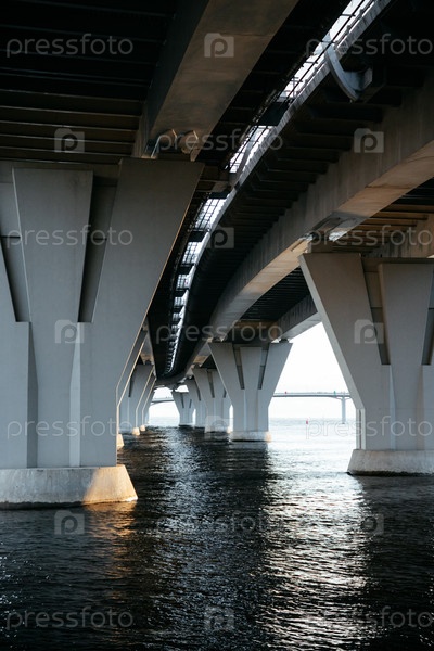 Вид с нижней части арки подвесной дороги, моста над водой, скоростной трассы против неба