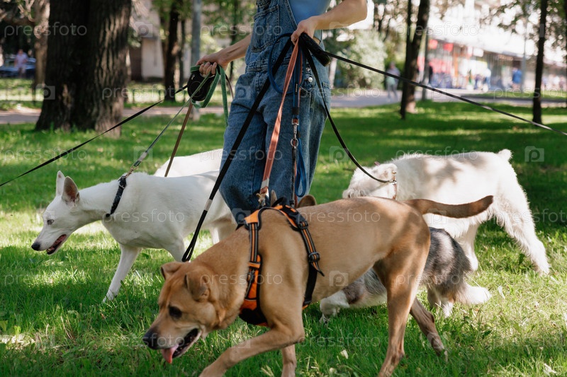 Молодая девушка-прогулка гуляет с собаками на газоне в парке. концепция дружбы, домашнего питомца, отдыха
