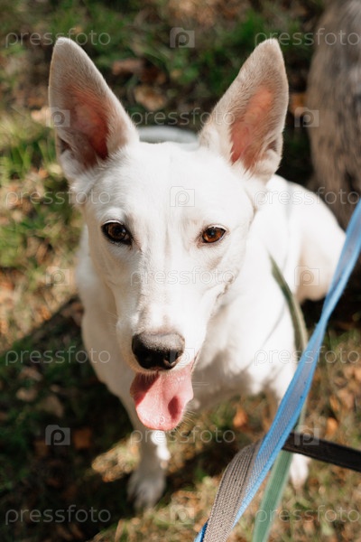 Вид белой собаки, сидящей на траве и гуляющей с домашним животным в солнечный день