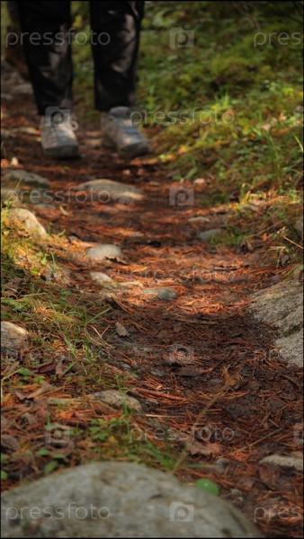 Лесная тропа, по которой ходят три человека, вид на ноги