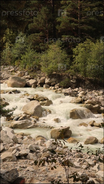 Горная река, вид на горы и деревья в лесу. природа, походы в дикой природе
