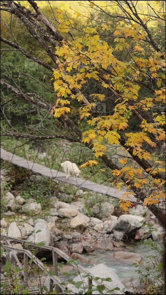 Большая белая собака пересекает деревянный висячий мост через реку. походы в горах с домашним животным