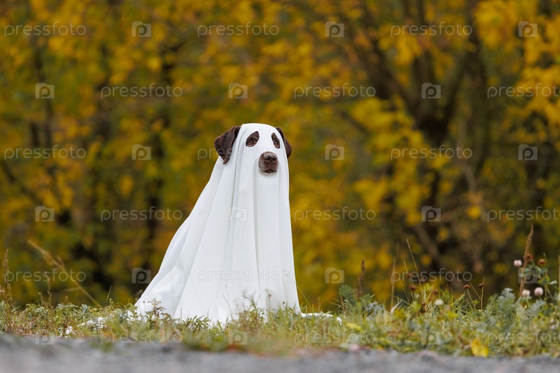 Милый лабрадорский пес, одетый в костюм призрака на Хэллоуин