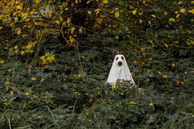 Лабрадорская собака, одетая как призрак Хэллоуина, скрывается в белом плаще