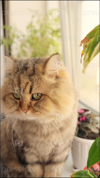 Большая кошка сидит на подоконнике. ленивый и сонный питомец отдыхает после обеда