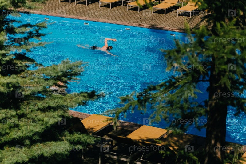 Плаватель, видимый сверху плавает на воде. открытый бассейн в загородном доме