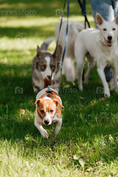 Собака бежит через поле с другими собаками.Собака носит красный пояс.Джек Рассел Терьер