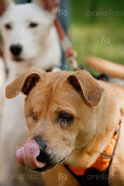 Питбульская собака без глаз в парке гуляет со своим хозяином на поводке. прогулка с домашними животными во время