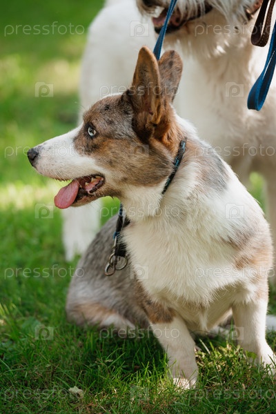 Марл Уэльский Корги Кардиган сидит на лужайке.Коргис гуляет в парке.Позаботьтесь о забавном питомце