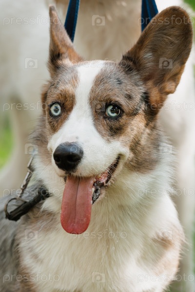 Марл Уэльский Корги Кардиган сидит на лужайке.Коргис гуляет в парке.Позаботьтесь о забавном питомце