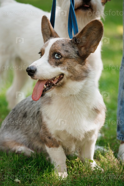 Марл Уэльский Корги Кардиган сидит на лужайке.Коргис гуляет в парке.Позаботьтесь о забавном питомце