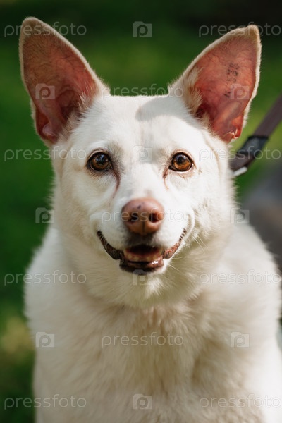 Белая собака в парке на прогулке с хозяином. гулять и тренировать домашних животных днем