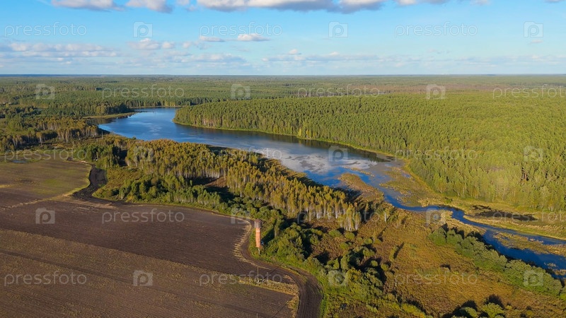Екатеринбург, Россия. болотистое озеро, река и хвойный лес вдоль берегов. Вечернее время, ранняя осень, Aerial View