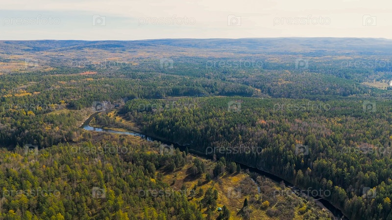 Бажуково, Россия. Осенний ландшафт. Река Серга. Оленьи ручьи. Природный парк в лесистой местности, известной богатой флорой, вид с воздуха