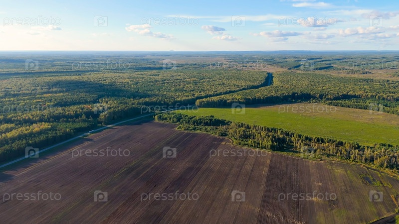 Екатеринбург, Россия. болотистое озеро и оробленное поле. Уборка урожая. Очистка картофеля. Вечернее время, ранняя осень, Aerial View