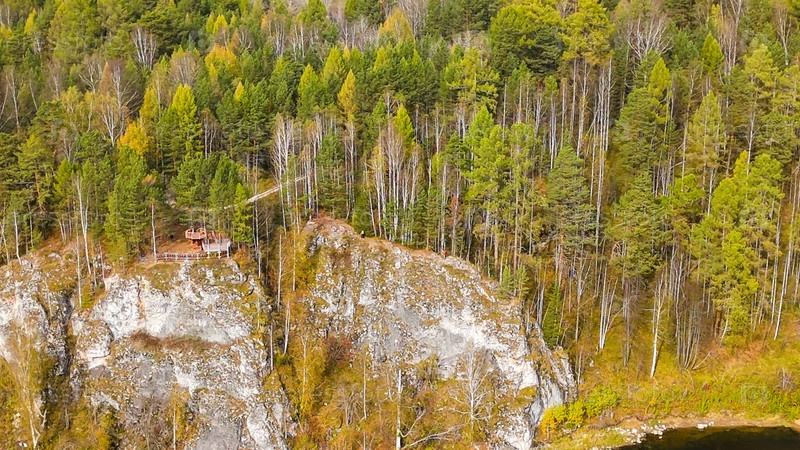 Бажуково, Россия. Светлая скала. Осенний пейзаж. Река Серга. Рейндерные ручьи - природный парк в лесистой местности, известный своей богатой флорой, вид с воздуха