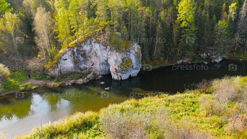 Бажуково, Россия. Каменная дыра или пьяный конь. Осенний пейзаж. Река Серга. Оленьи ручьи. Природный парк в лесистой местности, известной богатой флорой, вид с воздуха