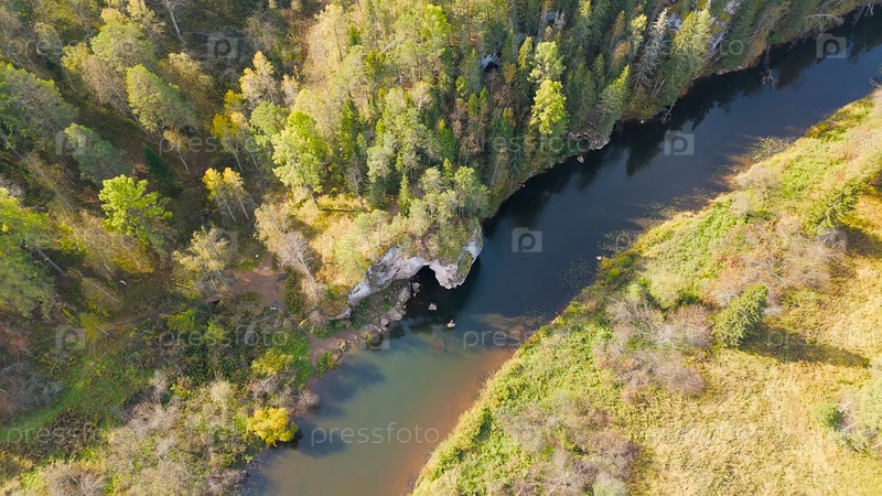 Бажуково, Россия. Каменная дыра или пьяный конь. Осенний пейзаж. Река Серга. Оленьи ручьи. Природный парк в лесистой местности, известной богатой флорой, вид с воздуха