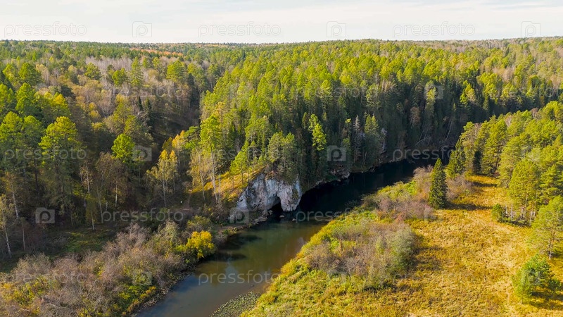 Бажуково, Россия. Каменная дыра или пьяный конь. Осенний пейзаж. Река Серга. Оленьи ручьи. Природный парк в лесистой местности, известной богатой флорой, вид с воздуха
