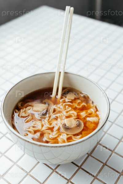 Вид на острые мгновенные лапши с кусочками грибов, зеленым и красным перец чили, овощи