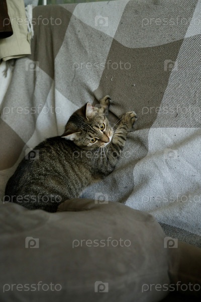 Полосатый домашний кот отдыхает и играет дома. милый пушистый питомец сидит на паркете или диване