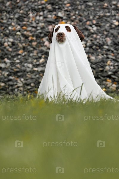 Милая лабрадорская собака, одетая как призрак Хэллоуина, сидит в осеннем парке