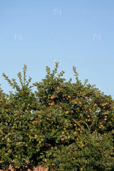 Зрелые сочные яблони. сбор фруктов в саду. ферма, плоды яблок на голубом фоне неба
