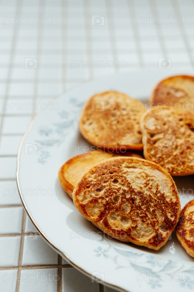 Жареные блины на тарелке на кухонном столе, завтрак в солнечное утро