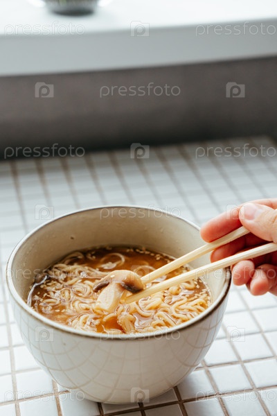 Острые мгновенные лапши с кусочками грибов, зеленым и красным перцем чили и овощами, крышка
