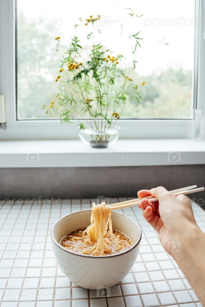 Азиатская фаст-фуд, мужчина с помощью палочек для еды мгновенного рамена, миска супа из лапши дома