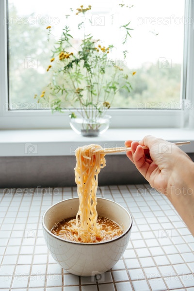 Азиатская фаст-фуд, мужчина с помощью палочек для еды мгновенного рамена, миска супа из лапши дома