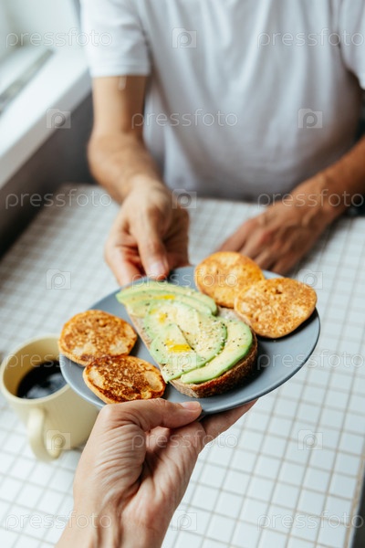 Мужчина завтракает дома на кухне. тарелка с тостом из авокадо, блинами и черным кофе