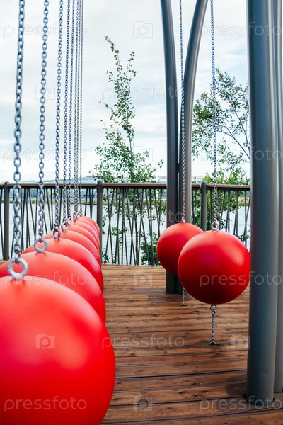 Пешеходная зона на promenade в парке. красный сферический качели на цепях