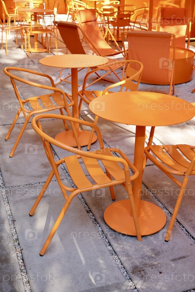 Кафе-ресторан, оранжевая мебель столов и стульев для гостей. уютная улица с кафе-столами