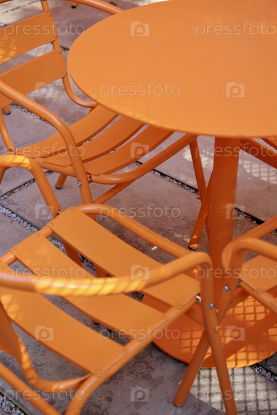 Кафе-ресторан, оранжевая мебель столов и стульев для гостей. уютная улица с кафе-столами