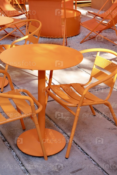 Кафе-ресторан, оранжевая мебель столов и стульев для гостей. уютная улица с кафе-столами
