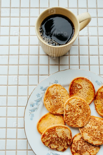 Кофе и блины на тарелке на кухонном столе, завтрак в солнечное утро. здоровая еда